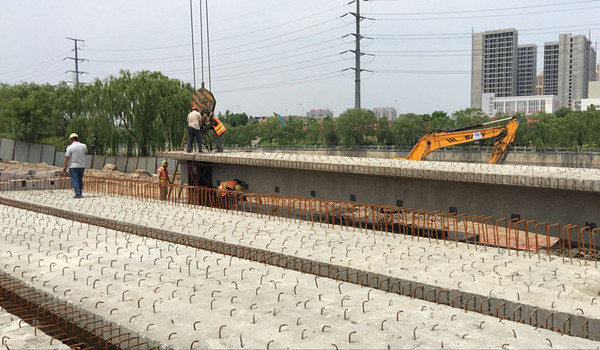 5月18日上午9時(shí),濱河南路拓寬改造工程第一塊T型板梁正式開(kāi)始吊裝。該橋設(shè)計(jì)寬26米,橋跨18米,橋型為一跨簡(jiǎn)支變截面肋梁橋,主梁采用裝配式后張預(yù)應(yīng)力混凝土變截面T梁,吊裝后濕接。經(jīng)過(guò)連續(xù)不間斷作業(yè),于下午16時(shí)圓滿完成七塊主梁、兩塊邊梁,共計(jì)九塊板梁的吊裝任務(wù),比原計(jì)劃提前一天,至此標(biāo)志著橋梁主體結(jié)構(gòu)工程順利完成。為保障此次吊裝作業(yè)的順利進(jìn)行,項(xiàng)目部科學(xué)部署,精心組織,提前策劃,并與交警等相關(guān)部門充分溝通,確定合理的運(yùn)輸路線和時(shí)間。項(xiàng)目部設(shè)立吊裝安全保障小組、明確責(zé)任分工;詳細(xì)制定切實(shí)可行的施工方案,做到以方案指導(dǎo)施工;認(rèn)真做好各項(xiàng)施工前準(zhǔn)備工作:包括技術(shù)準(zhǔn)備、機(jī)械設(shè)備準(zhǔn)備、勞動(dòng)組織準(zhǔn)備、施