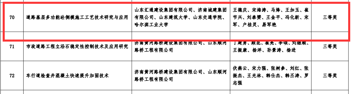 近日,山東匯通建設集團有限公司工程管理部根據濟南土木建筑學會轉發的《推薦2021年度“山東土木建筑科學技術獎”》的通知要求和評審辦法積極組織申報建設科技創新成果獎。公司申報的3項課題全部獲獎,其中“低溫期瀝青路面施工工藝技術研究與應用”項目獲二等獎,“耐高溫抗車轍瀝青路面施工工藝技術研究與應用”項目獲三等獎,“道路基層多功能砼側模施工工藝技術研究與應用”項目獲三等獎。三個項目經專家評價總體達到國家先進水平。